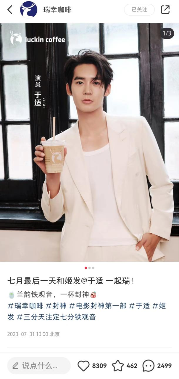 7月20日《封神》刚上映,31日瑞幸就把饰演姬发的于适收入麾下;《长相思》刚播一半,角色们刚开始刷脸,瑞幸就与剧中饰演玱玹的张晚意合作;而在剧组扫楼送咖啡的活动中,檀健次送出的也是瑞幸咖啡...这种主打一个“及时”的轻量化合作,能让观众将剧集和生活无缝连接在一起,让他们以get角色同款的方式去延续人物和故事带来的感动,还带火了兰韵铁观音拿铁和丝绒拿铁这两款单品。