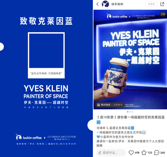 1956年,克莱因用一种无色的合成树脂介质与群青颜料结合,调配呈现出“理想之蓝”。从各大艺术展到各行各业,小到箱包、服装、手机壳、配饰等单品,都曾刮过“克莱因蓝”之风。作为《伊夫·克莱因——超越时空》展览的官方合作伙伴,瑞幸不仅将《乔纳森·斯威夫特(ANT125)》这件作品打造了联名杯套,也举办了提供免费咖啡、送门票等活动,用“克莱因蓝”延展“瑞幸蓝”的内涵。