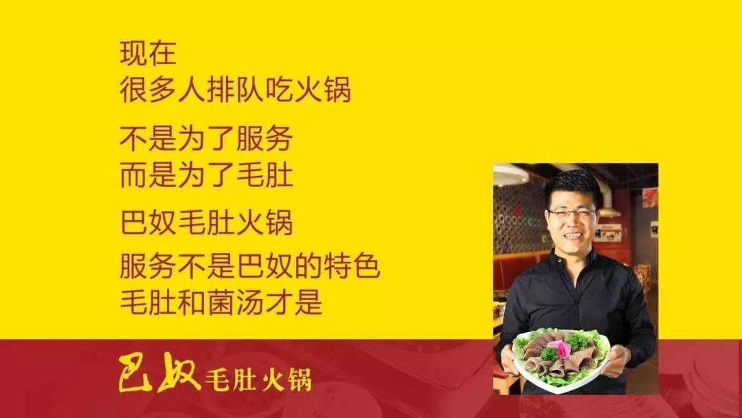正确的做法是巴奴毛肚火锅,针对海底捞服务好的对立面,强调自己产品好。从事实上说,海底捞全国统一配货,要追求产品的标准化,确实很难做到专注产品特色。