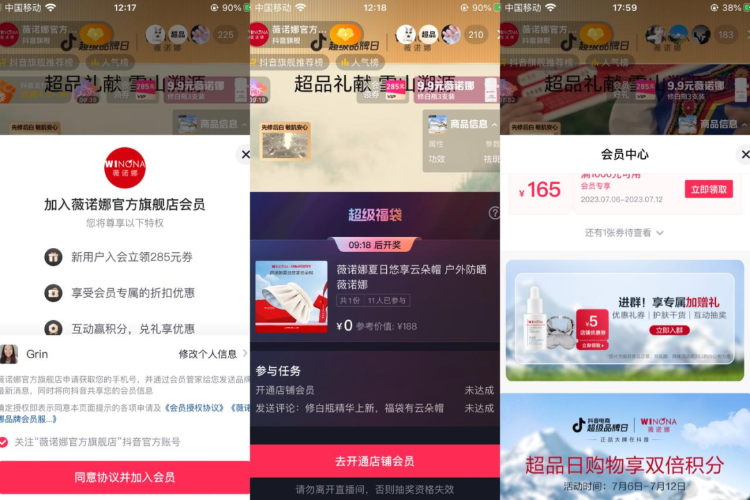2)主页商品栏,有提示加入薇诺娜会员俱乐部。主页简介也都有入会领券提示/粉丝群标记。