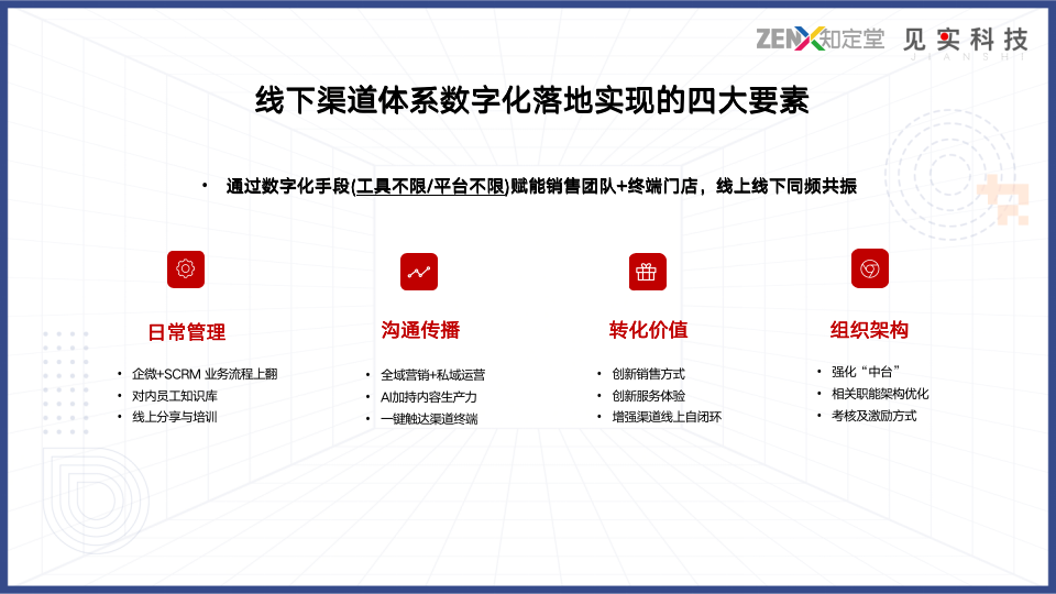 今天我们讨论的线下生意的数字化可能涉及四个主要方面:日常管理、沟通传播、价值转化以及组织架构。