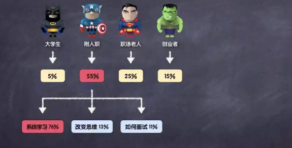 我们针对这个具体的人群去进行他们需求的细化调查,会知道针对系统学习这一个需求是76%,改变思维的需求13%,面如何面试是11%,这是刚入职人群的学习需求。