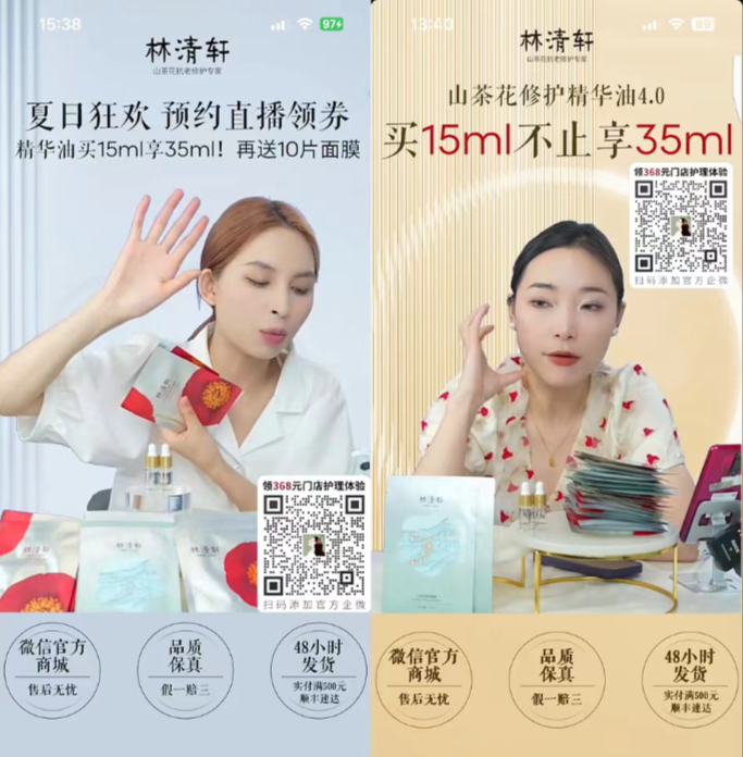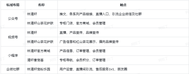 林清轩品牌在微信生态的链路闭环已经基本形成,公众号-视频号-直播-社群-小程序所有触点都在用,很大程度上可以互相引流,夏盖了微信用户能接触到品牌的所有入口。