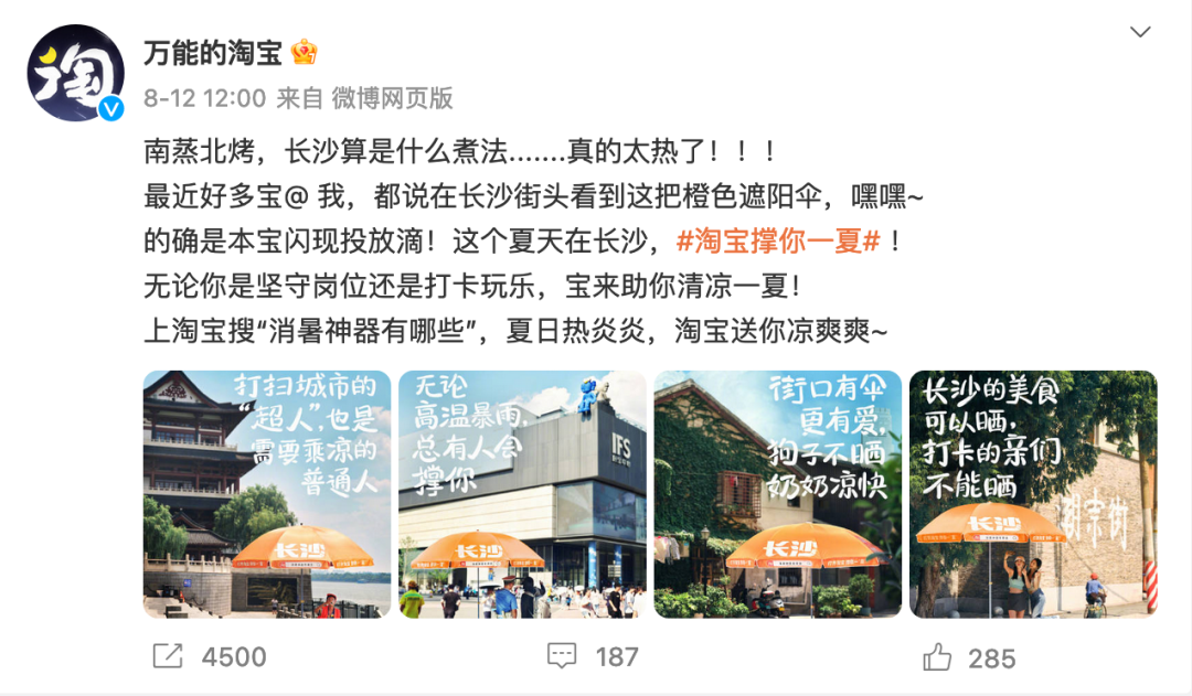 这是淘宝用实际行动致敬高温工作者,给烈日下的行人带来一些阴凉。