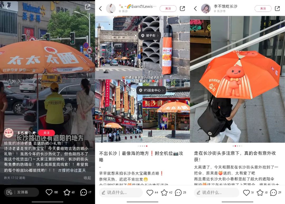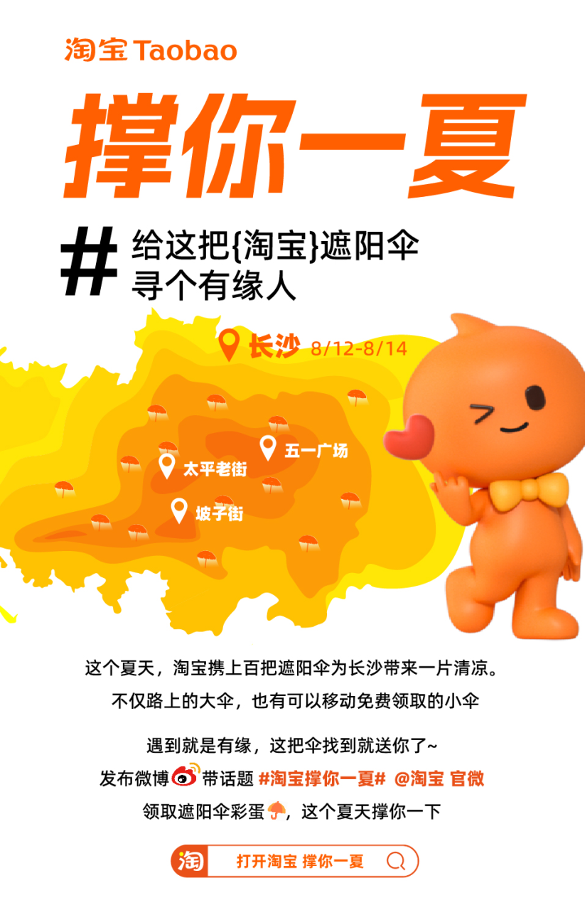 在这样新的玩法之下,淘宝还做了延伸的创新——在长沙全城藏了100把小遮阳伞,送给路过的有缘人。
