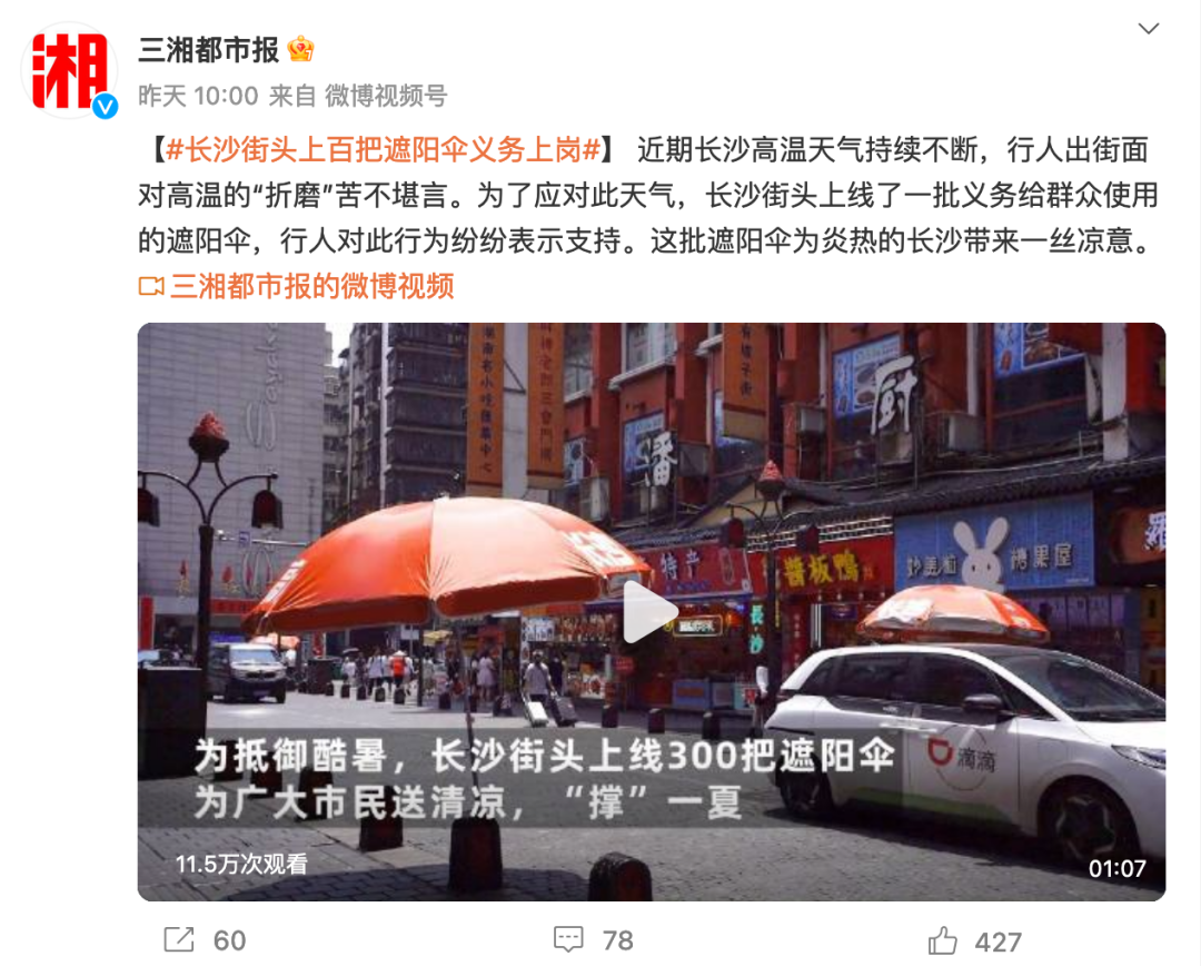 微博话题#长沙街头上百把遮阳伞义务上岗#迅速登上微博热榜及长沙地域榜TOP1, 并引发大量自来水参与。