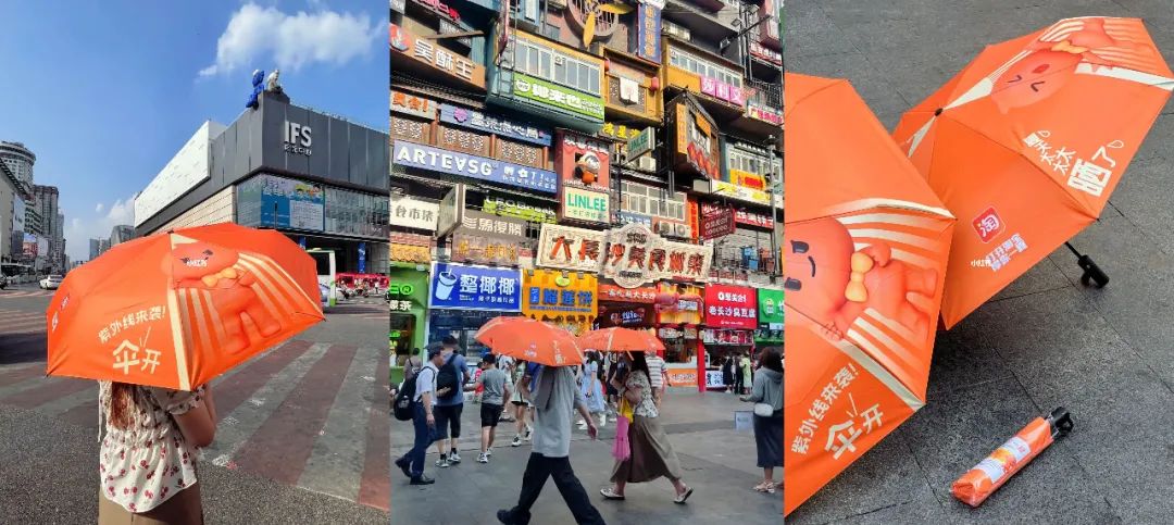 像一场街头的艺术活动,在路边的电线杆、地铁的出站口、街角的绿化带……你都可能和一把小伞不期而遇,感受淘宝给身心的一阵凉爽。
