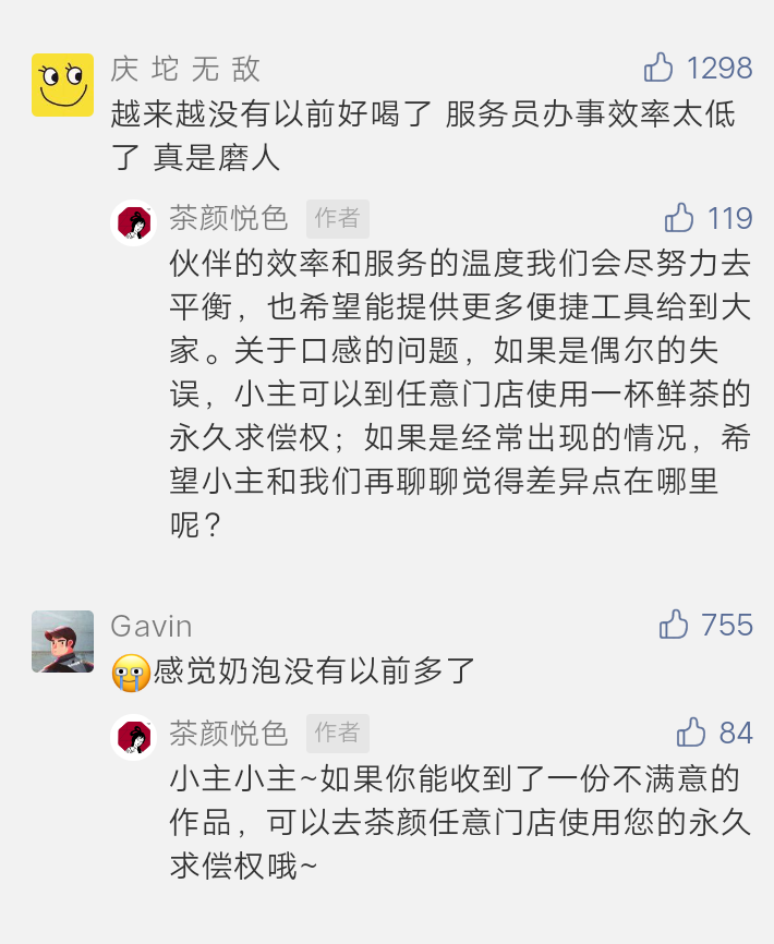 茶颜悦色甚至对自己的产品问题也发布在自媒体上,创始人的人设也是低调有趣的: