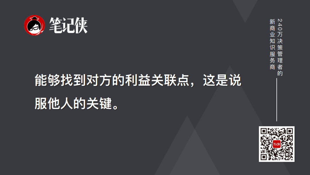 所有的这些,都需要你去说服对方。在这个过程中,我们不妨转变一下思路,这件令你困扰的事情会对他产生什么影响?是否会影响他的收益预期?真正站在对方的角度去发掘他的利益关联点。