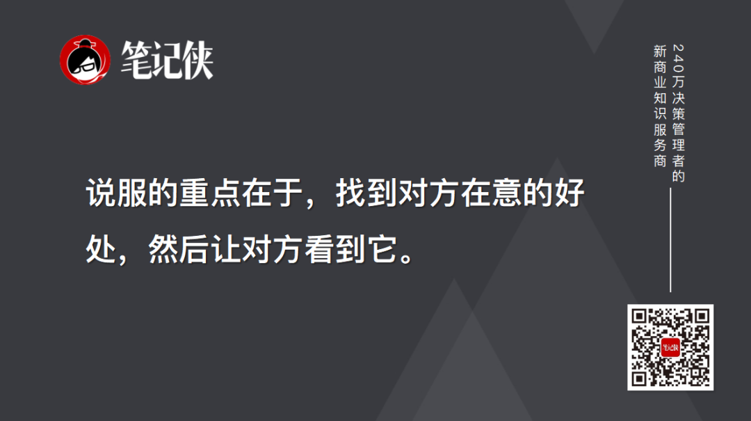因为每个人,都是站在自己的利益角度去考虑的,都在寻求自身利益的最大化。所以,说服的重点在于,找到对方在意的好处,然后让对方看到它。