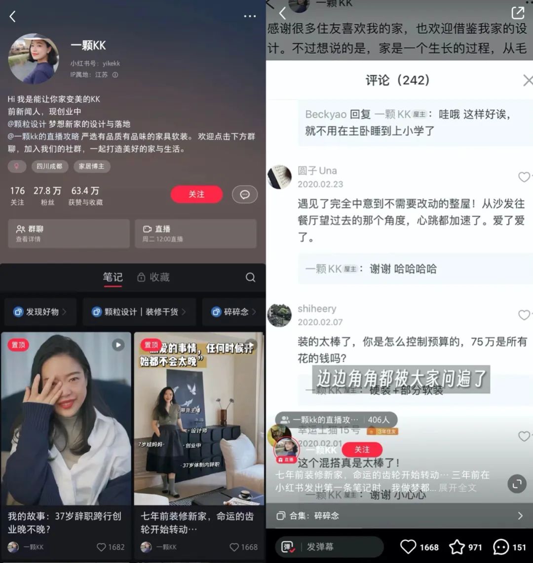 小红书向我介绍了几个平台买手,比如小红书上的家居博主“一颗KK”,在 2016 年纯靠网购把自己的房子从零开始装修了起来,每件家具都是自己亲手挑的,装好把家里的发到小红书上,甚至有人看到之后 1:1 复刻了她的家。