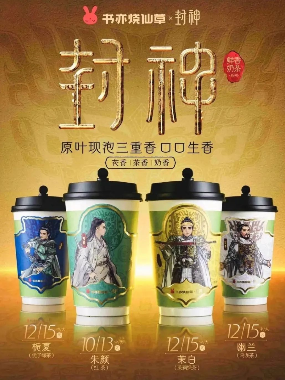瞄准网友喜好的书亦烧仙草老脸一红的上线了四款奶茶,并联名姬发、殷郊、殷寿、妲己、杨戬等人物,出街同款杯套包装。如果仅仅是换个包装,那可远没达到出街的效果,接下来书亦的操作,才让你真正明白什么叫“烧”的炸裂。