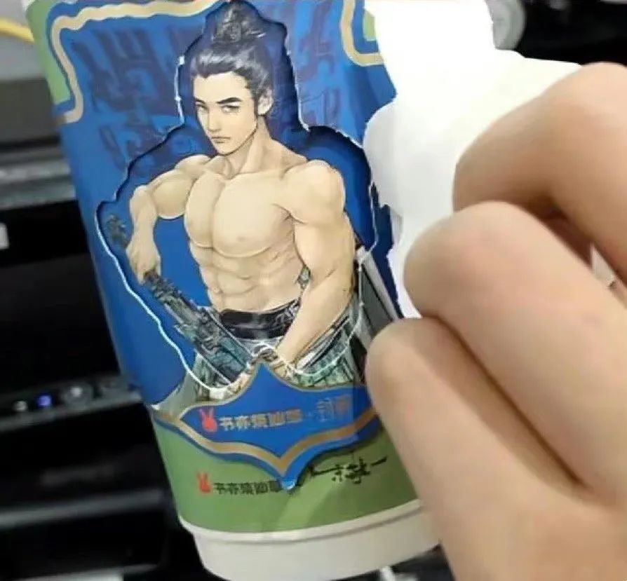 原本包裹严实的“马甲”被消费者轻易撕下,露出大胸肌,粉丝们见状突然口渴,吸了一口奶茶压了压惊。