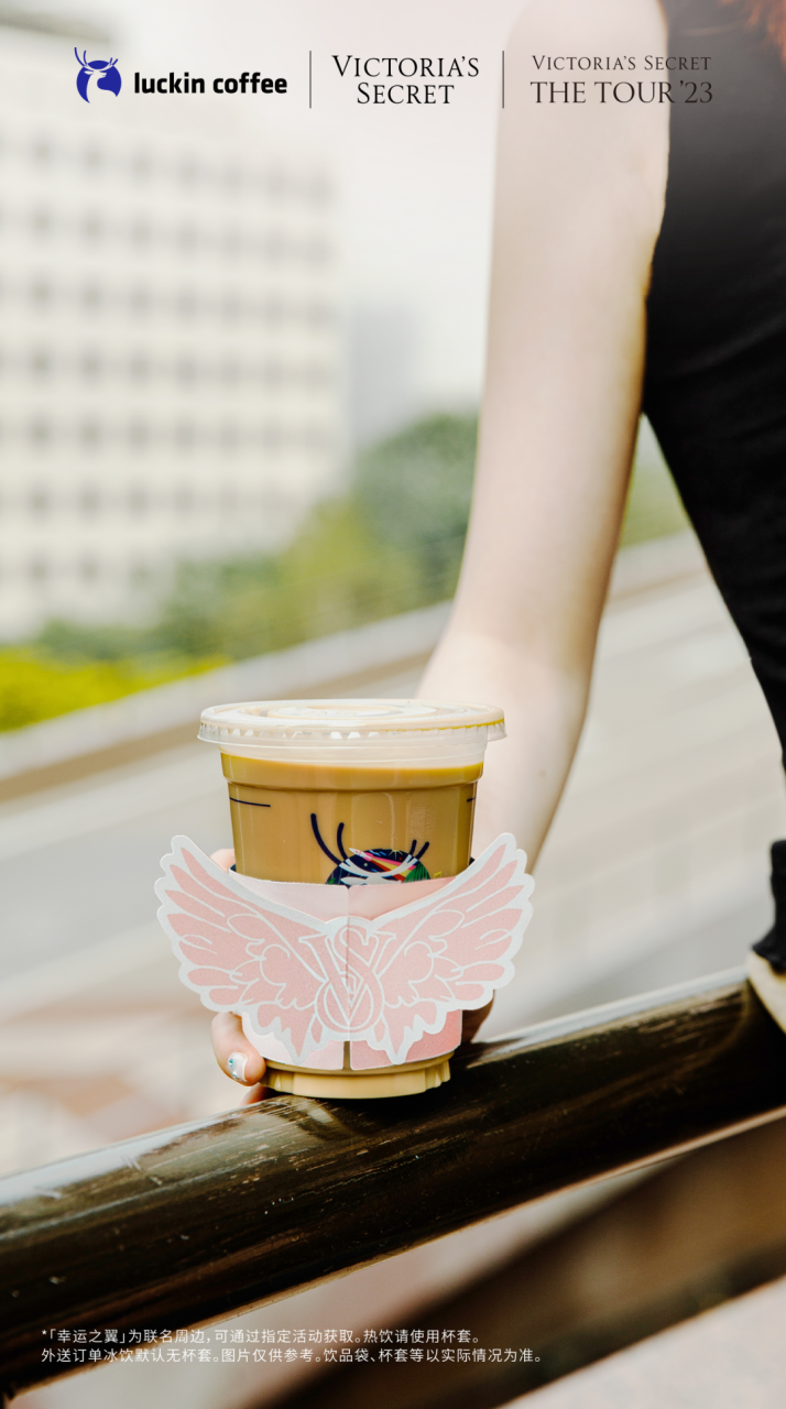 果不其然,为庆祝维秘大秀的回归,瑞幸以秋意浓浓的桂花龙井拿铁作为底,维秘的经典粉为衣,上线配套杯套和纸袋周边,外送订单还可获得以维密翅膀为灵感的限量周边「幸运之翼」,这让不少网友直呼“我也有维密天使翅膀”了!