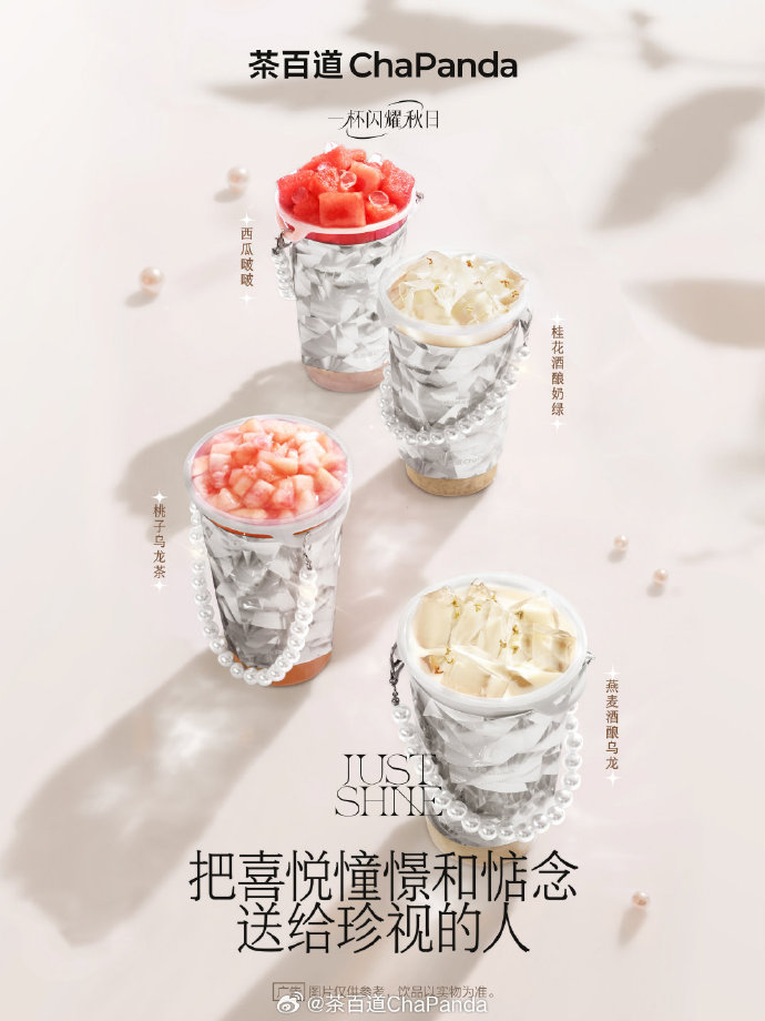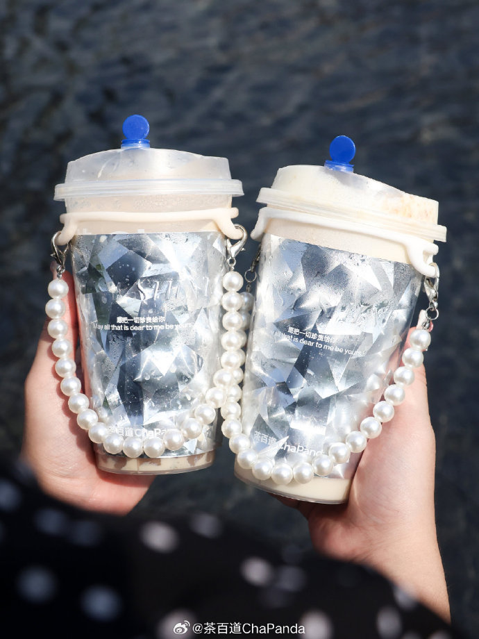 有人把袋子变成包,还有人把主意打在了奶茶杯上。月初,茶百道推出「茶百道闪闪杯」套装,该包装以女生的珍珠包为灵感,水晶质感的闪亮杯套与珍珠手提链组成“闪亮奶茶包”,包装寓意把喜悦、憧憬与惦念送给珍视之人。这bling-bling 的「秋日富贵花」让谁狠狠心动了?!