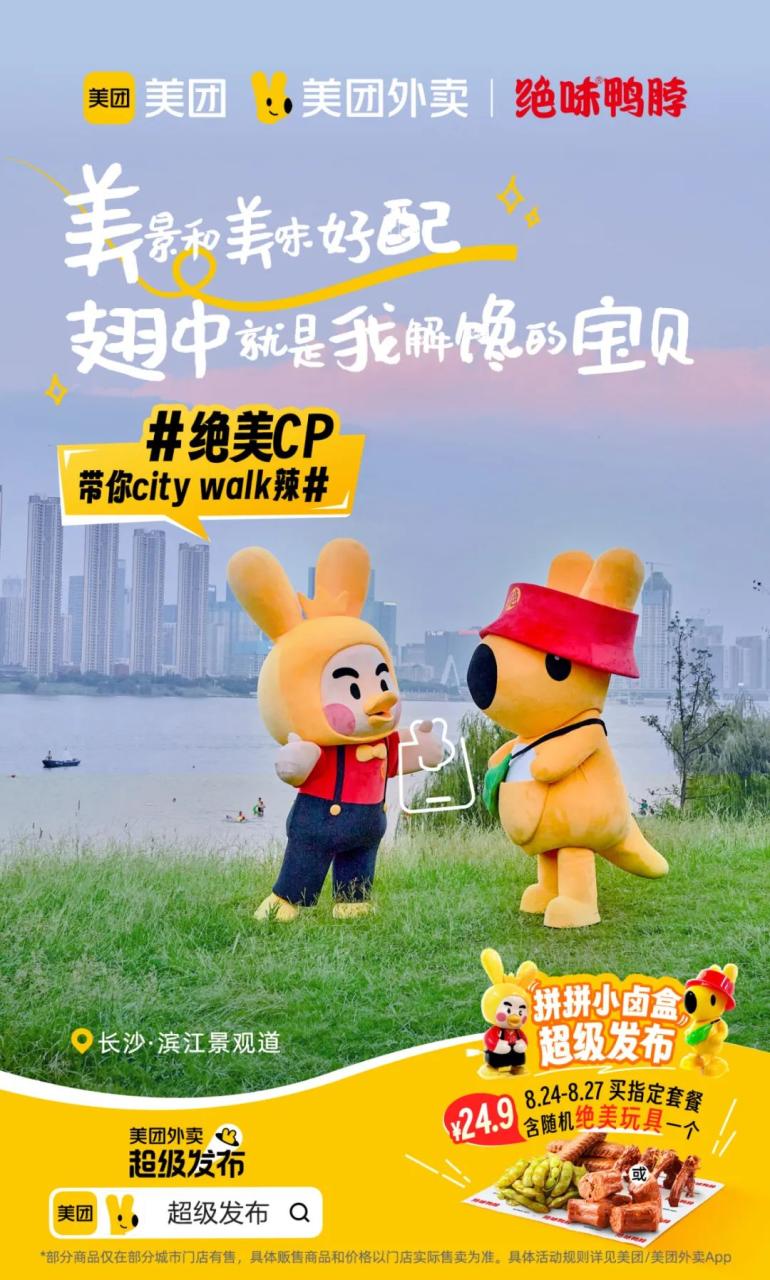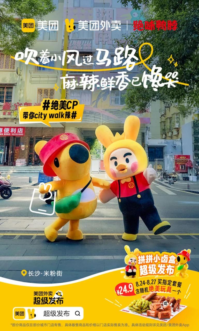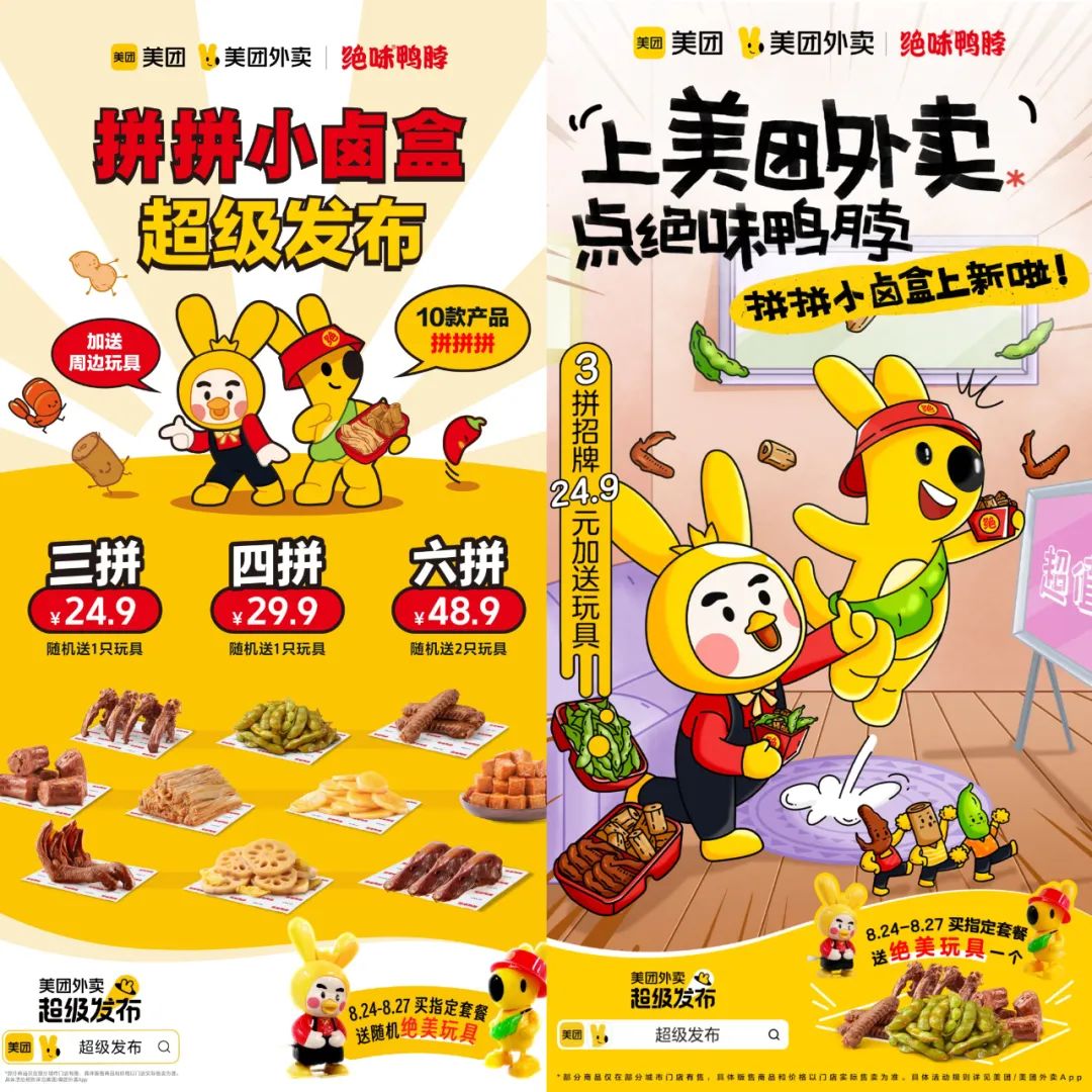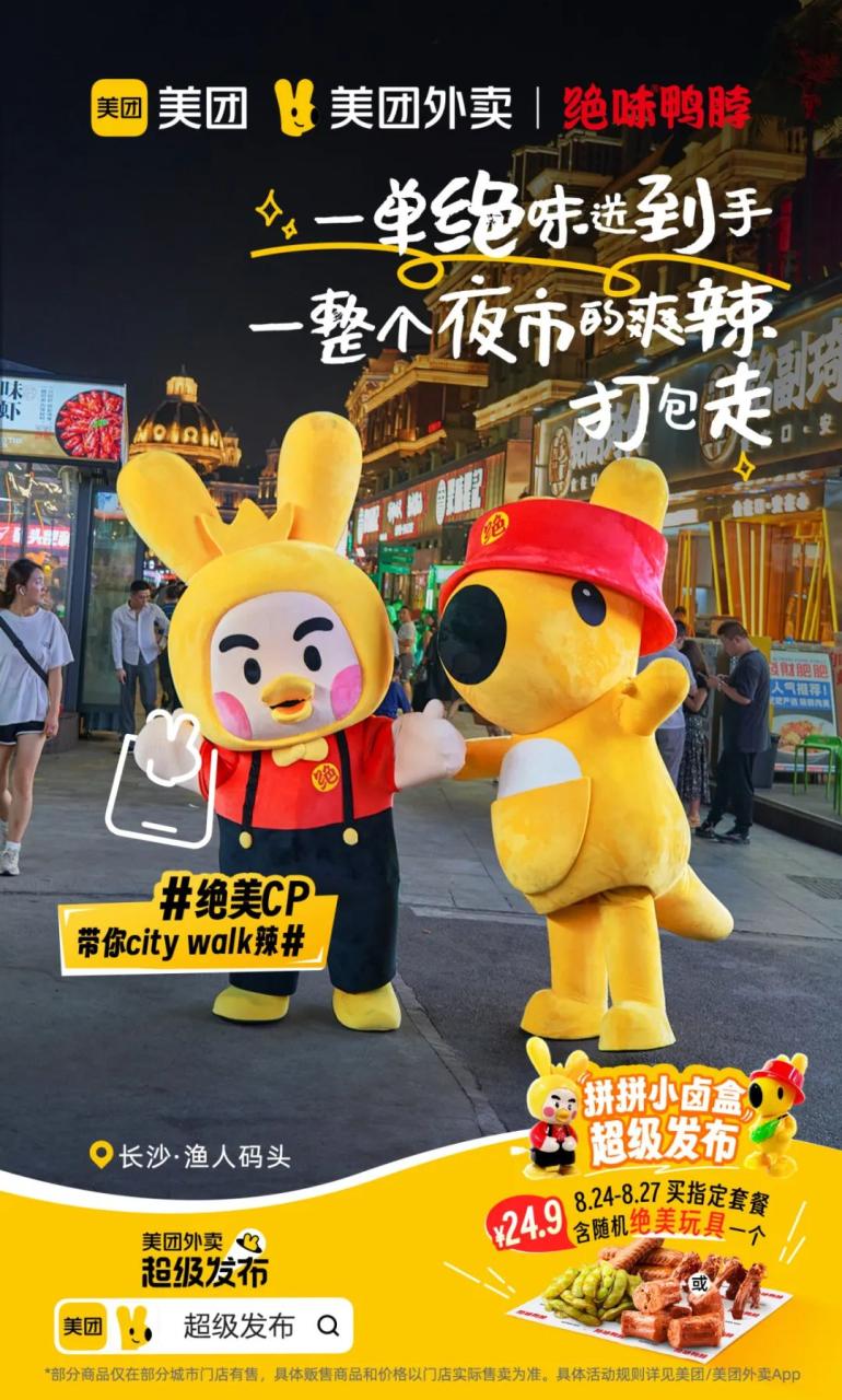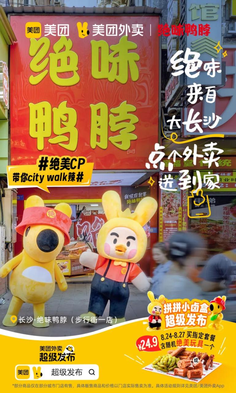 如果说满足用户需求的供给是第一步。那么第二步,绝味鸭脖和美团外卖通过营销内容和当代年轻人共情,吸引用户浏览、下单、购买。绝味鸭脖给出的解决方案就是构建一个“沟通场”,通过全方位、有层次的传播内容去吸引用户,在深度绑定合作双方的同时,做出更完整的信息表达。为了凸显“小份菜”+“拼拼“的需求场景,绝味鸭脖和美团外卖“超级发布”首次携手,将品牌与平台的吉祥物深度联合,打造成为 “绝美CP”,演绎用户拼卤味的场景需求。
