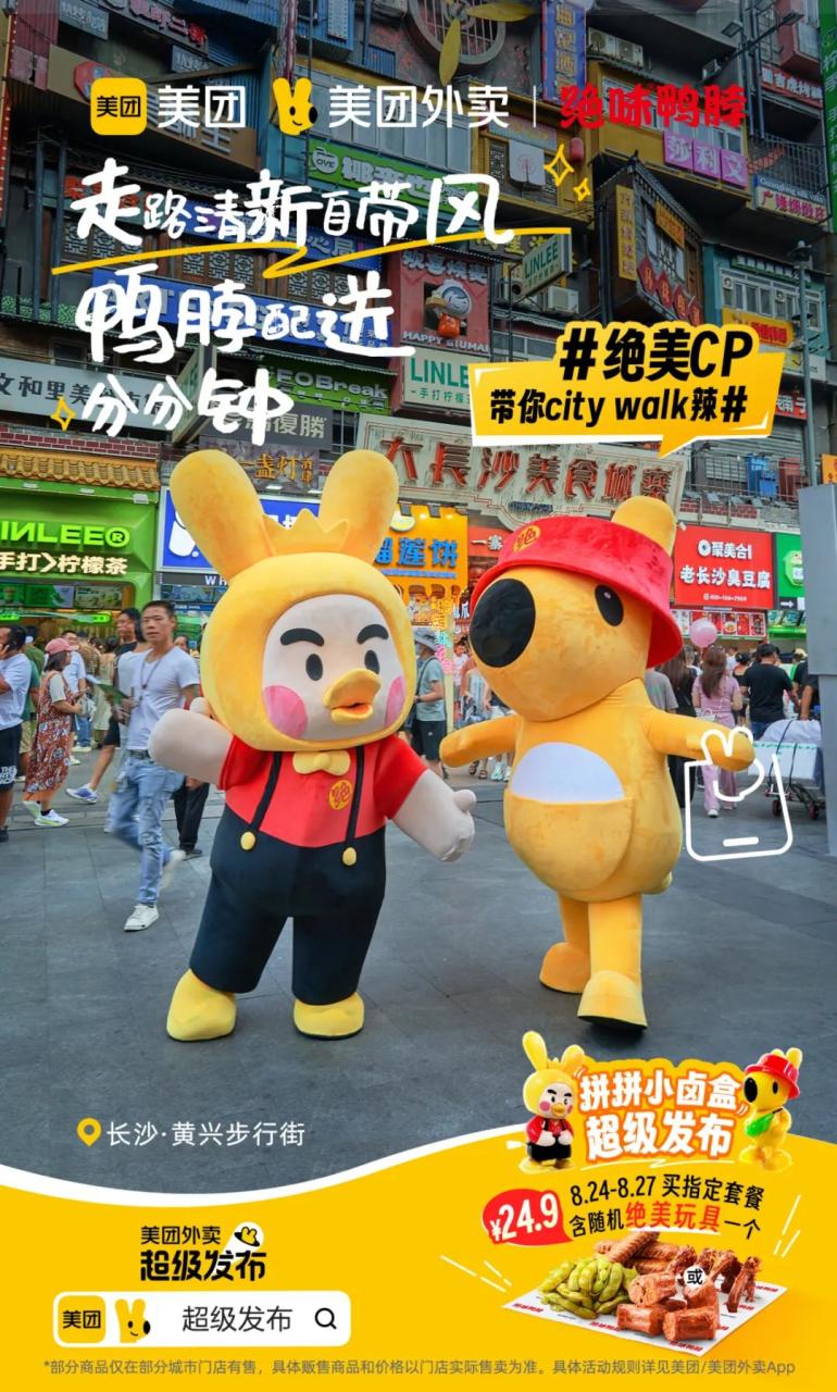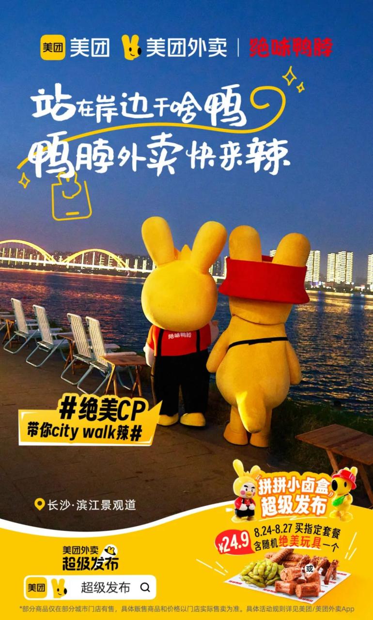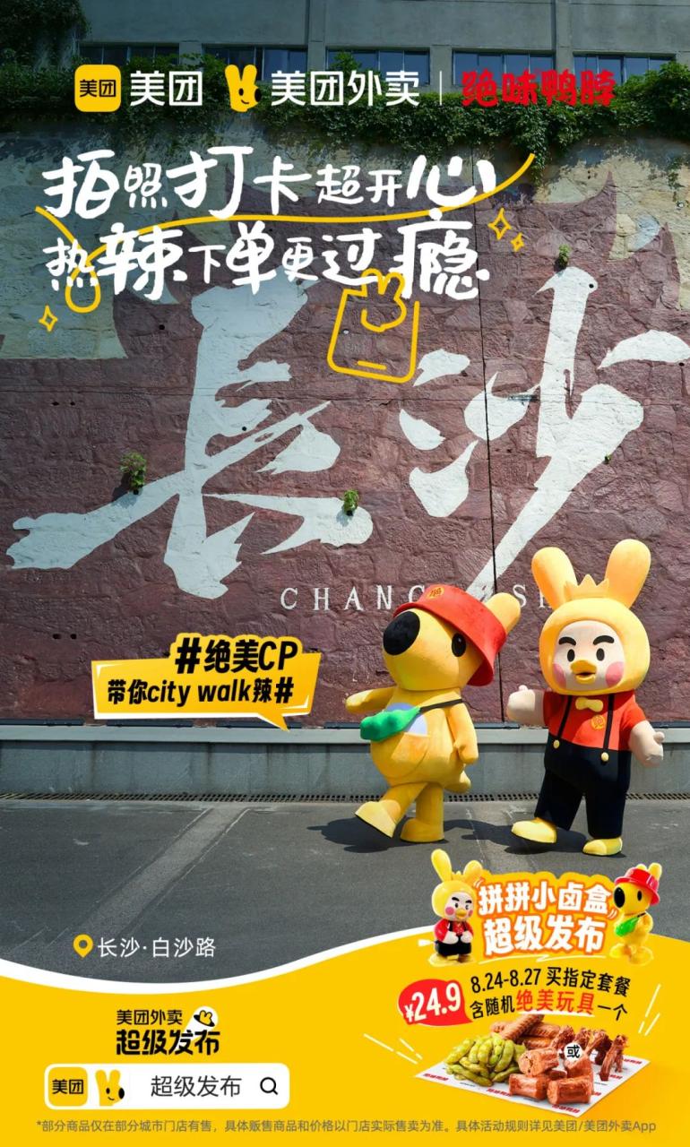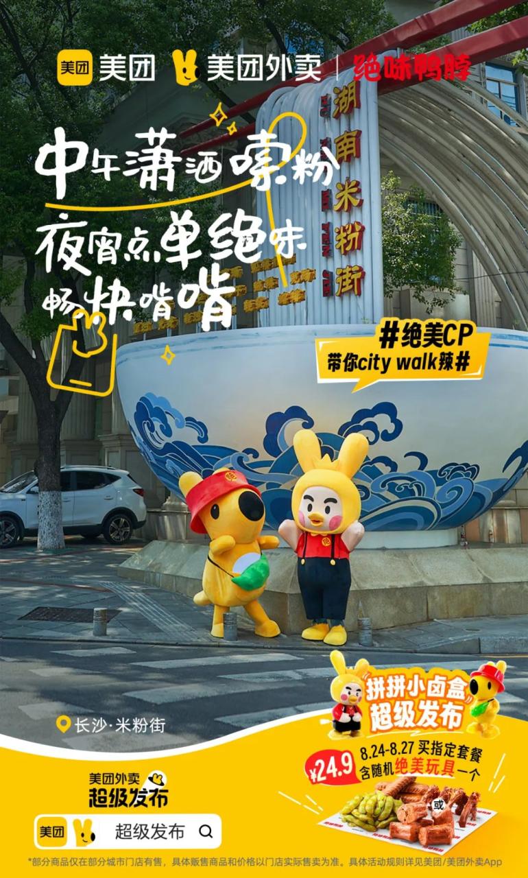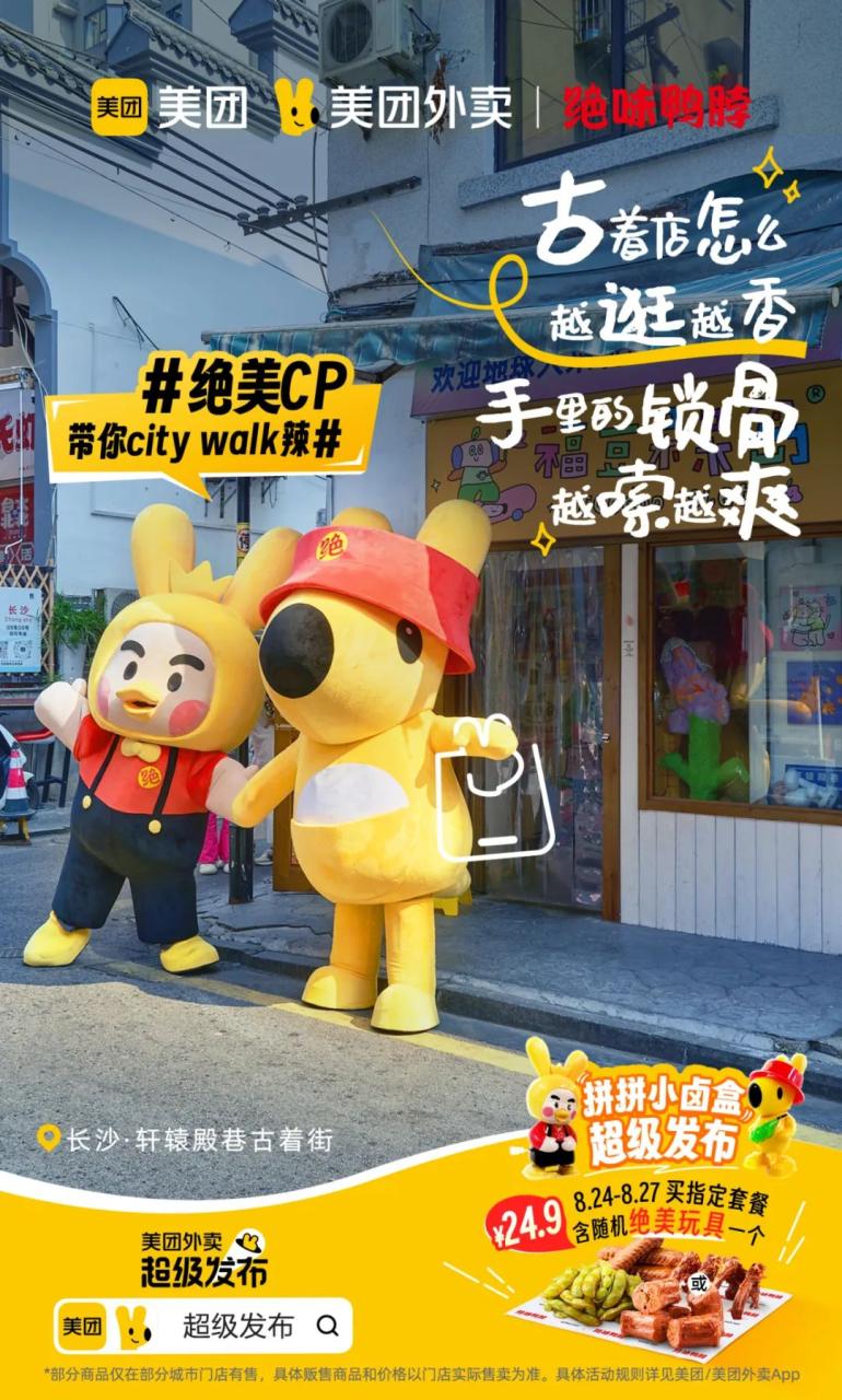 如果说满足用户需求的供给是第一步。那么第二步,绝味鸭脖和美团外卖通过营销内容和当代年轻人共情,吸引用户浏览、下单、购买。绝味鸭脖给出的解决方案就是构建一个“沟通场”,通过全方位、有层次的传播内容去吸引用户,在深度绑定合作双方的同时,做出更完整的信息表达。为了凸显“小份菜”+“拼拼“的需求场景,绝味鸭脖和美团外卖“超级发布”首次携手,将品牌与平台的吉祥物深度联合,打造成为 “绝美CP”,演绎用户拼卤味的场景需求。