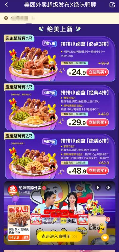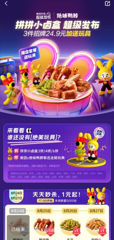 绝味鸭脖和美团外卖,为了进一步助力品牌在暑期期间的增长,双方针对外卖渠道的特点,上新了“拼拼小卤盒”套餐。开创了小份量卤味,多种菜品搭配、用户根据口味喜好组合、更实惠的价格,适配卤味“一人食”及“多人食场景”。双方还共创了人气度极高的周边“绝美CP玩具”。新颖的产品搭配方式、质感十足的走路玩具,直接击中了新生代消费者的内心,引发了无数用户的热烈追捧。数据显示,此次活动期间单日营业额破千万,拼拼小卤盒套餐销量十数万份,绝味CP玩具销量近10万(个),拉新近30W,其中下单新客占比50%以上。