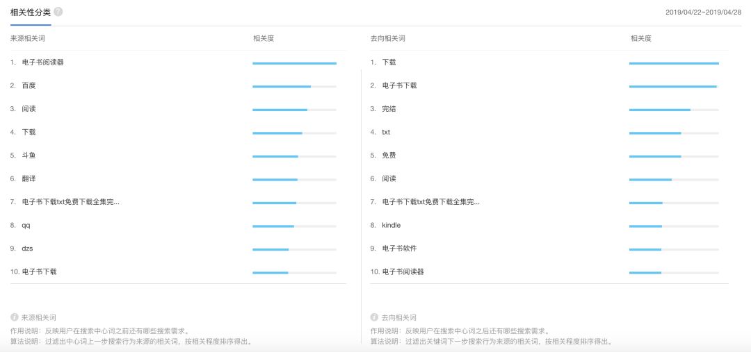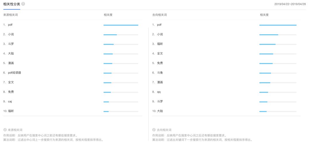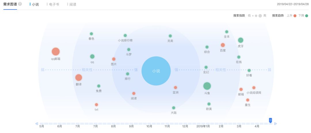 你还会发现「图片」啊「漫画」啊和「小说」的关联度还挺大,所以,是不是考虑一下看看目前的入口是否可以往这些方面去靠,或许能开辟一个新入口也不一定呢——这是为了确保渠道触达的效率,否则,有需求的用户找不到你,没需求的用户看了不理你。