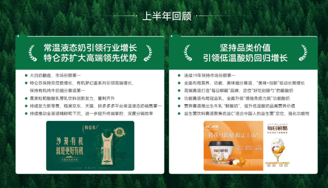 在常温奶方面,今年上半年,蒙牛常温液态奶市场份额进一步提升。常温特仑苏、蒙牛母品牌牛奶销售引领行业增长,实现大白奶市场份额第一。蒙牛旗下大单品特仑苏,持续扩大高端奶市场份额领先优势。