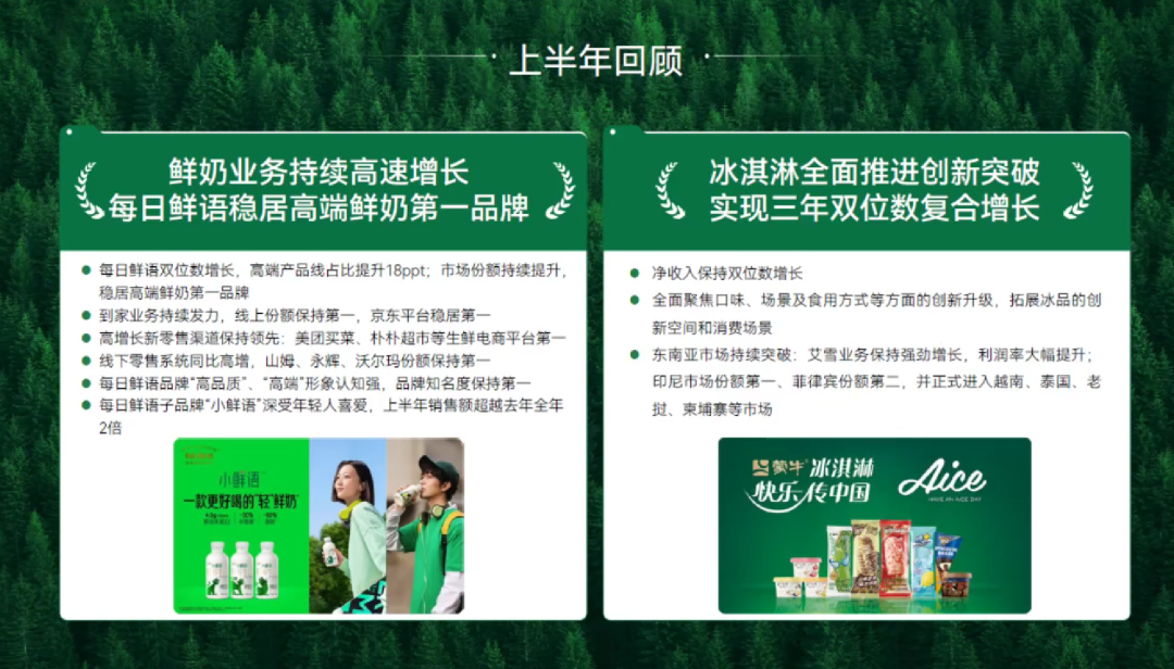 此外,今年上半年,蒙牛鲜奶业务增速继续跑赢行业,高端品牌每日鲜语双位数增长,市场份额持续提升,稳居高端鲜奶第一品牌,并推出新品娟姗4.0鲜牛奶。