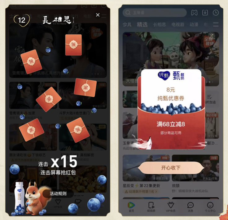 乳品的营销一直都走在全行业的前面,但乳企激烈的竞争下,乳品营销也难免陷入同质化火拼。蒙牛纯甄选择与腾讯视频的多款精品大剧合作,不光用大剧的IP带动品牌信息的渗透,从而在消费者心中烙下差异化的记忆钢印;还做了娱乐、社交、带货等多场域联动,把大剧IP带来的影响力落到实处。
