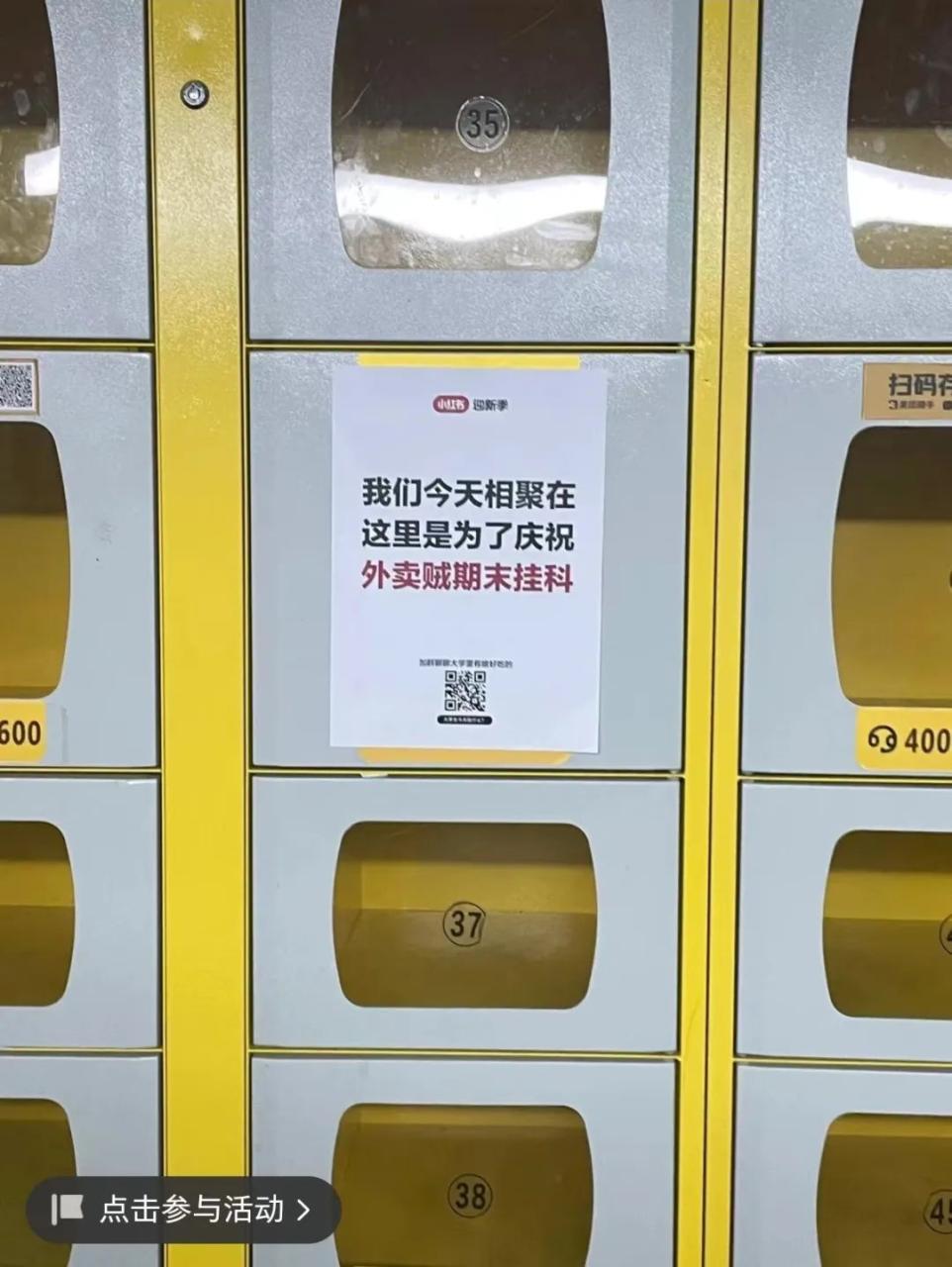 我们从小红书平台官方的校园活动里,可以更清晰地看到如何利用“情绪价值”。小红书在宿舍楼外卖柜、女厕所、流浪猫窝等大学生常去的地点,分别量身定制了一句 solgan 。比如外卖柜上的这句:“今天我们相聚在这里是为了庆祝外卖贼期末挂科”,一句话中融合了大学生熟悉的网络热梗,以及“外卖贼”和“挂科”两大痛点,可以说是情绪价值拉满。看到这句话的学生,很难不被戳中并忍住不扫二维码入群。