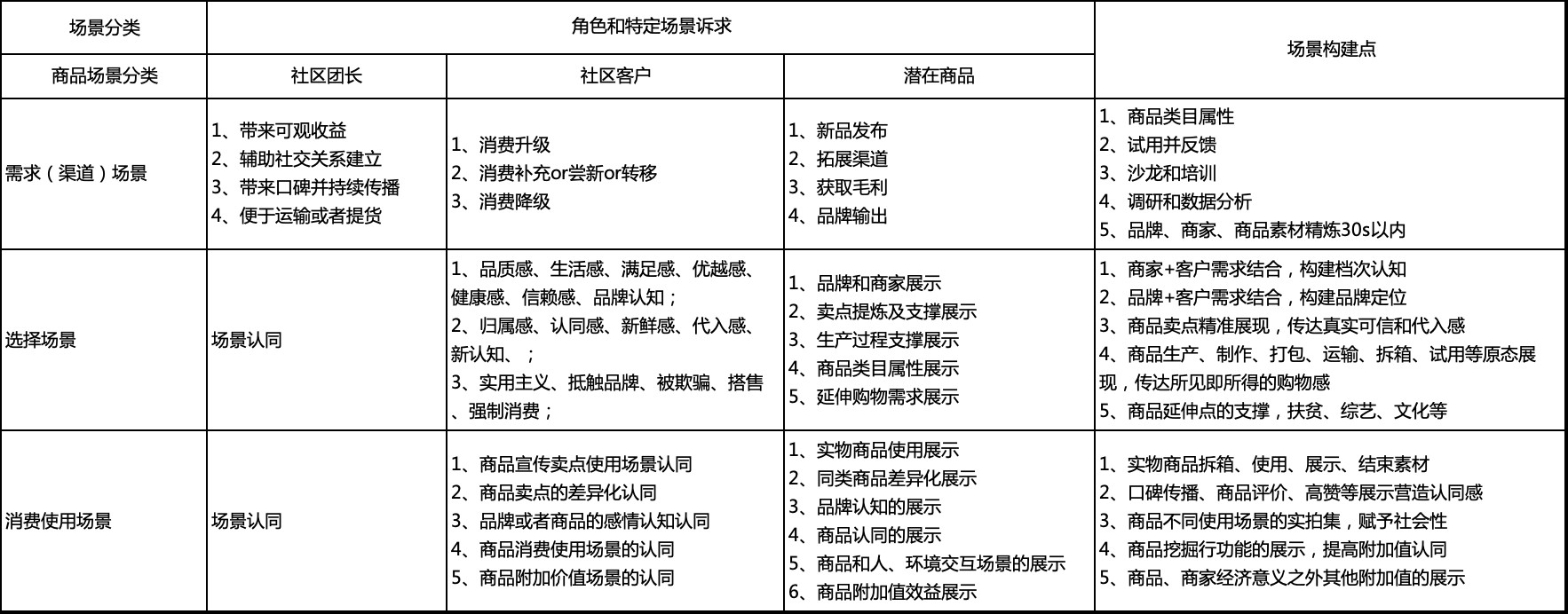 一般说的场景,是直接基于商品和人,是产品商品化过程中的一种营销手段。社区团购作为一个零售渠道,介入方在商品、物流、平台3端均有切入尝试,但是仍然是线上购物环境,需要场景来弥补购物体验缺失造成的感知断层。