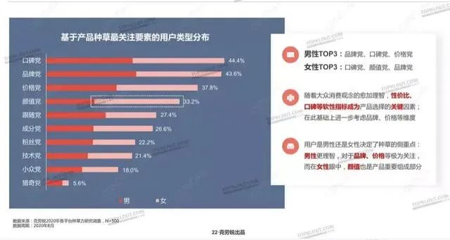 在产品种草偏好细分用户占比情况以及性别差异上,女性的偏好的决定性因素TOP3分别为:口碑、颜值以及品牌。该数据说明,产品在宝妈群体中的口碑直接影响了对产品的接受程度,这就是“种草”的力量。