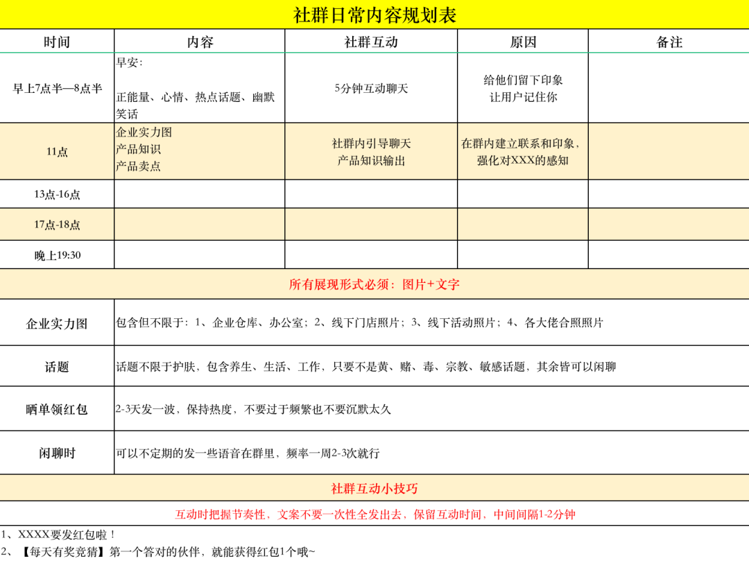 再说怎么规划内容。无论是朋友圈,还是社群,做内容都需要提前规划。看似简单的工作,实际操作过程中,经常会出现漏发、错发的情况。