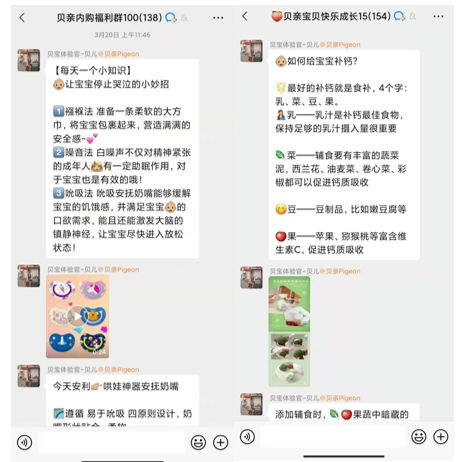 例如在贝亲的私域社群中,品牌对内容进行了细致的规划,提供了丰富的育儿经验,儿童的营养搭配,儿童成长过程的心理变化等知识,这都是宝妈想要了解的内容。