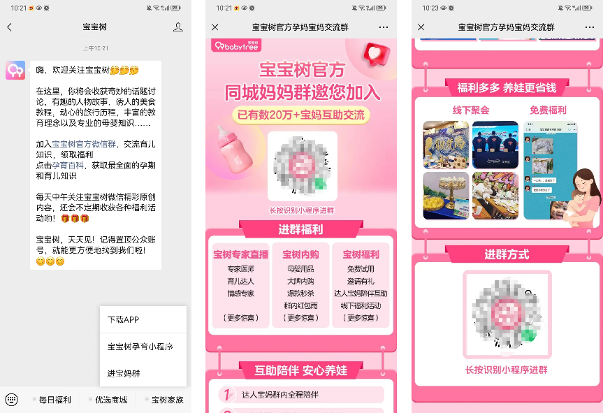 进入“宝宝树”公众号,菜单栏有一个“宝树家族”,会提供宝妈交流群的二维码,进入群后,流量自然到手。另一类女性APP,如美柚,会在APP内设置一些育儿板块,提供宝妈群。