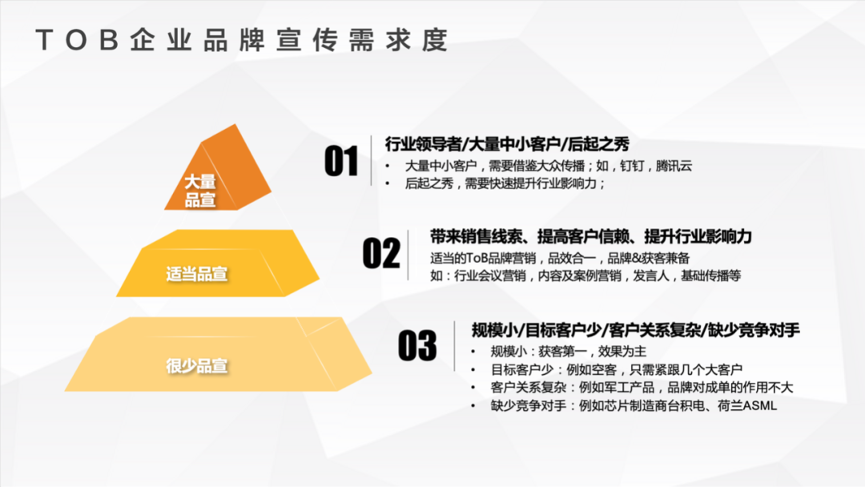SaaS、做成品工业产品的,如果如果目标客户数量较多,对品牌传播的需求就越高。