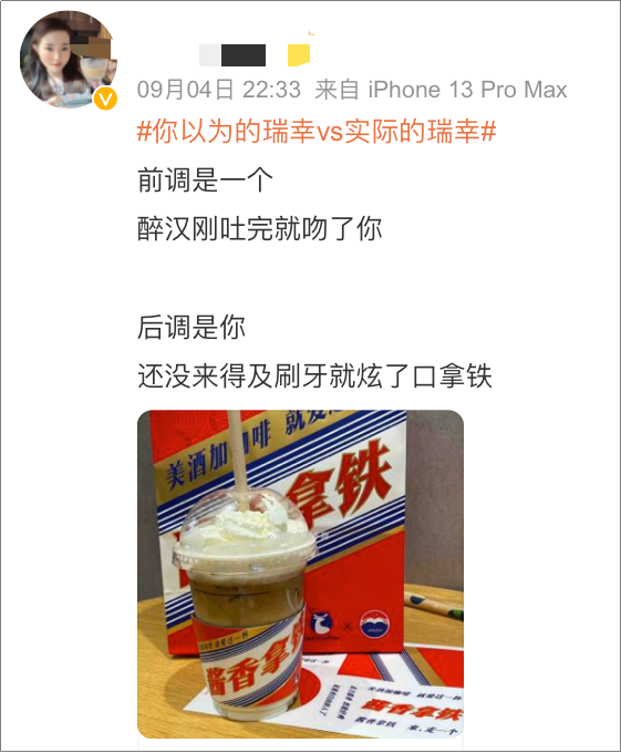 全网刷屏!瑞幸和茅台牵手,凭借一杯“酱香拿铁”让全国网友上头。