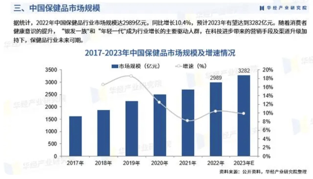 据统计,2022年中国保健品行业市场规模达2989亿元,同比增长10.4%,预计2023年有望达到3282亿元。