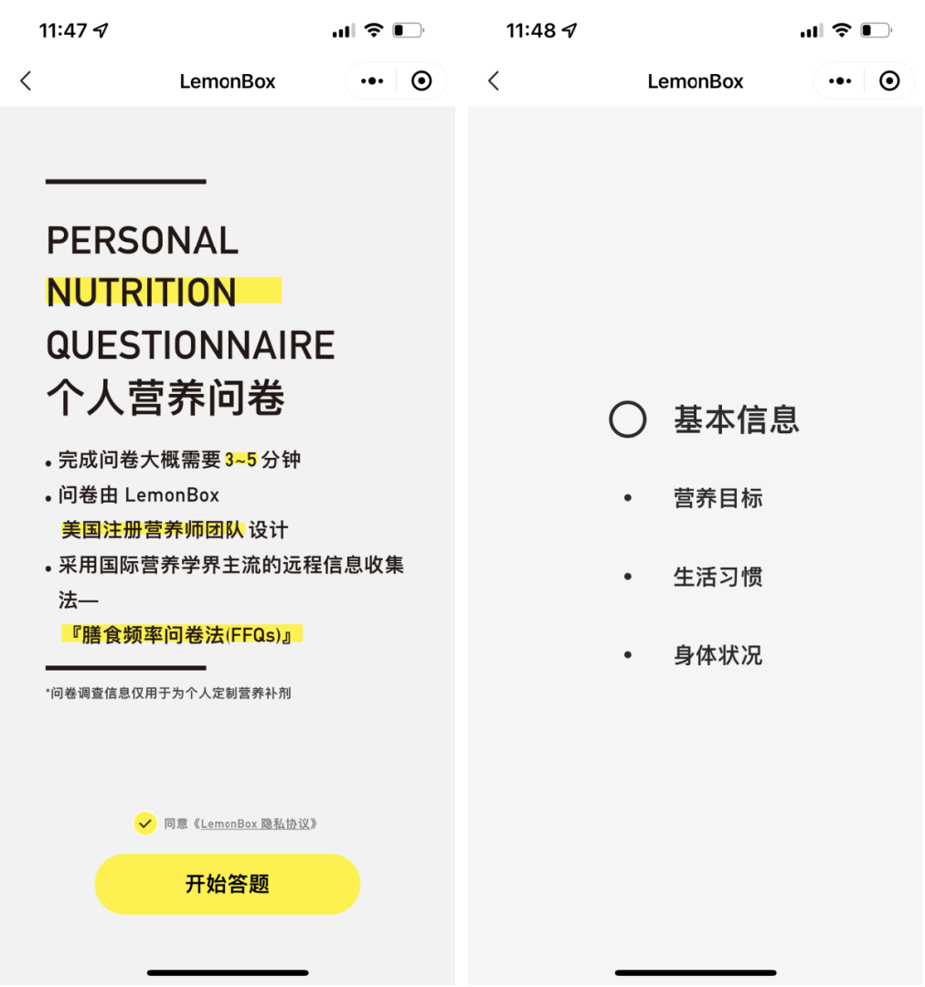 以DTC营养品牌「LemonBox」为例,它们是这样做的:用户进入私域小程序后,需要先做一个3-5分钟的“个人营养问卷”的调研形式,全面丰富用户标签。