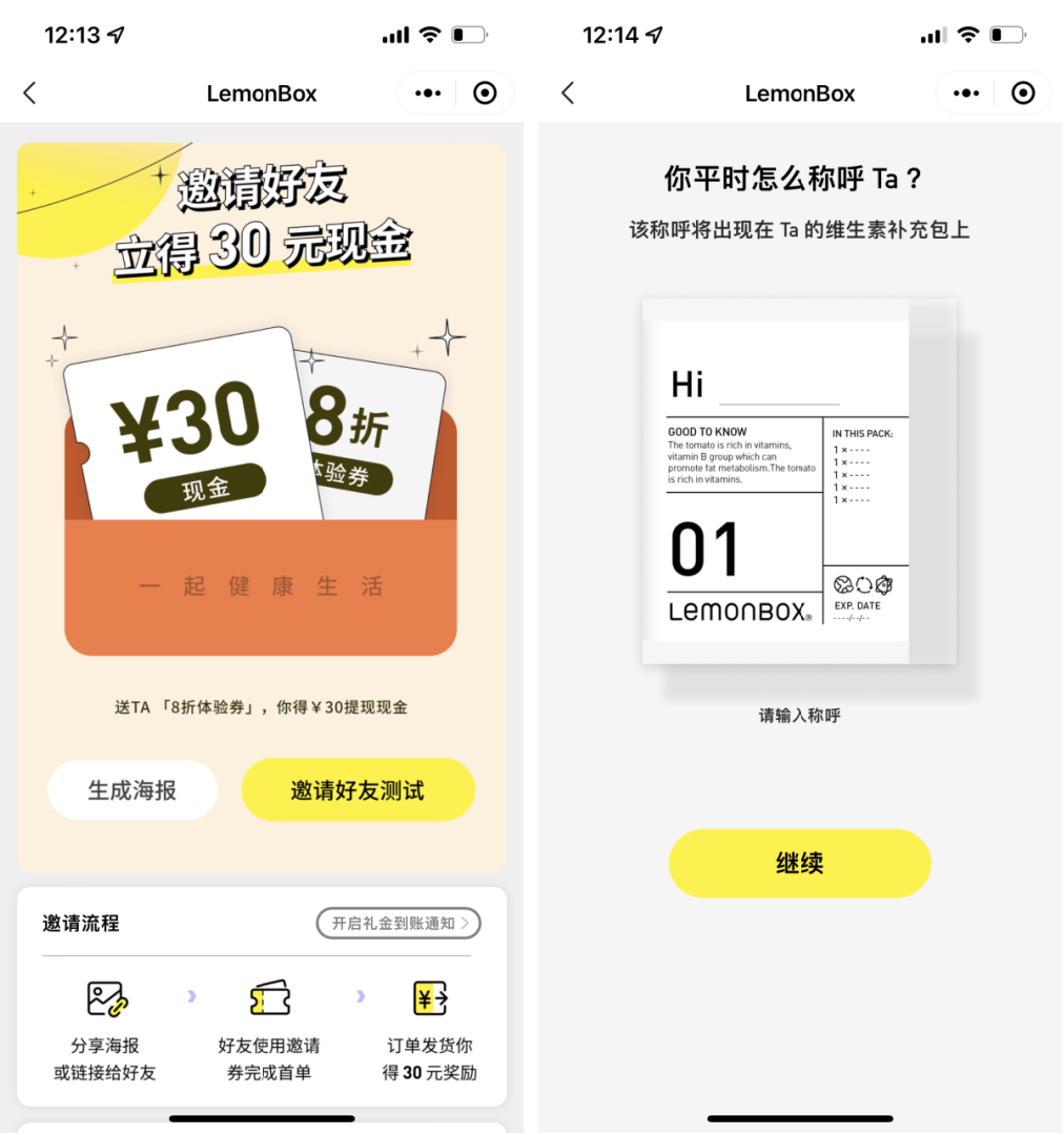 2)送礼活动:老客可以直接送LemonBox品牌的相关产品,也可以通过填写健康问卷赠送定制款,而收礼人的健康信息可以由送礼人代为填写,也可以转发问卷让收礼人亲自填写,创造了更多收礼人和品牌的触点。