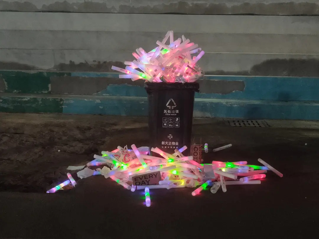 毕业晚会后的垃圾桶,装满了荧光棒,该怎么形容?