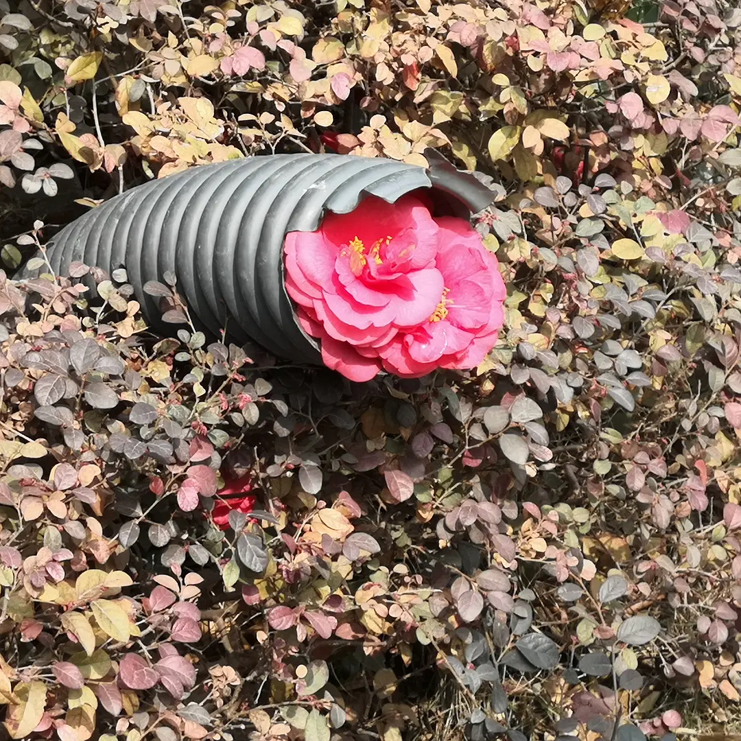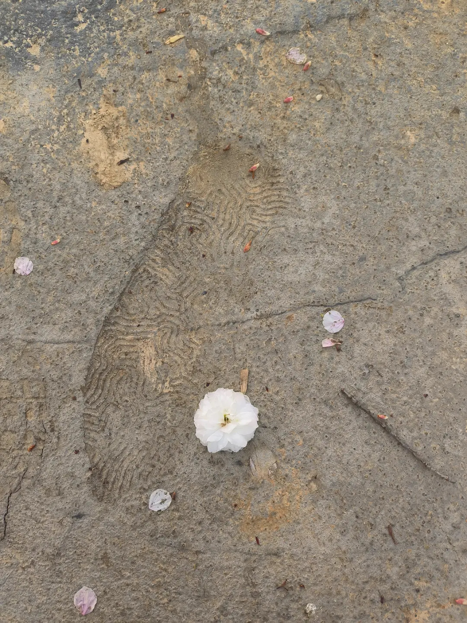 这朵花掉在地上特别好看,发现旁边有个留下的脚印。看着似有深意,却想不出怎么形容。