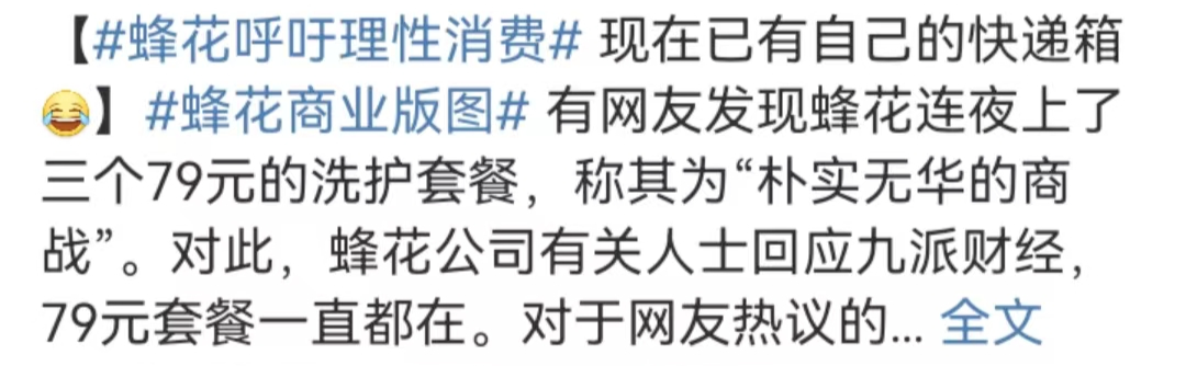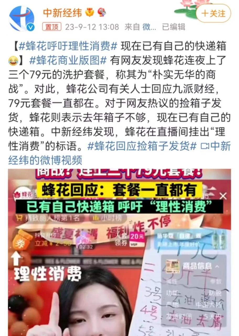 9月12日, #蜂花呼吁理性消费#的话题冲上热搜,连夜上架“79元花西子套餐”的蜂花,又迎来了新一波“泼天富贵”。