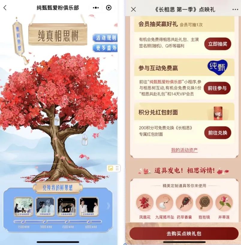 纯甄今年合作了热门大剧《长相思》,盘下了腾讯视频的超前点映产品,输送给私域里的用户。超前点映权益的分配,也不是粗暴地看谁的消费值更高就给谁。