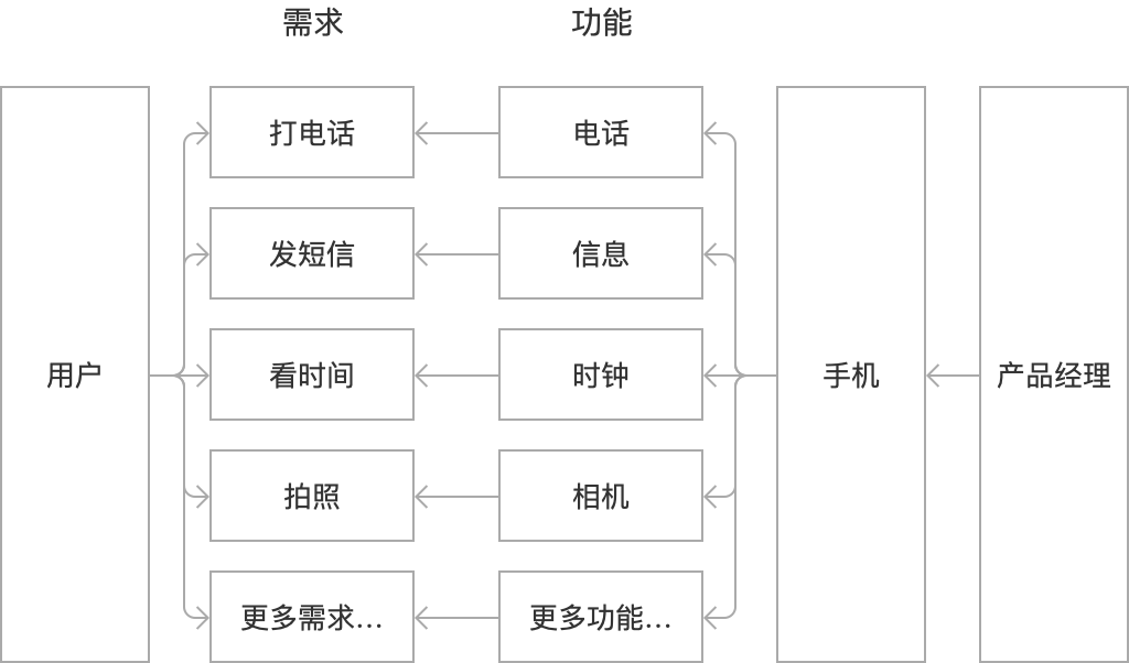 但除此之外,用户还有很多需求,发短信需求、看时间需求、拍照需求等等,都有对应的功能来满足。