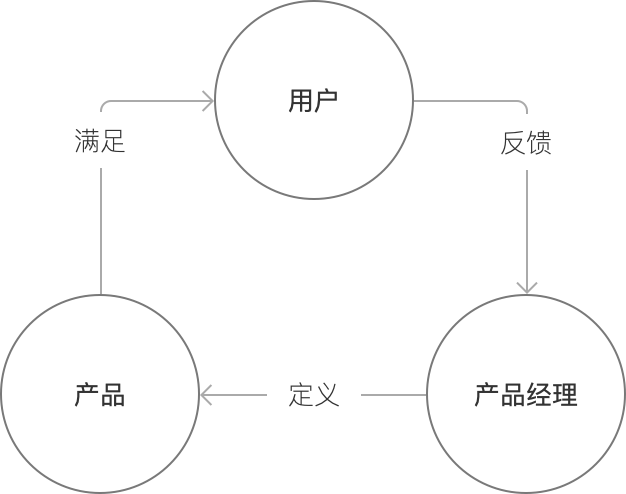 所以一句话描述三者的关系就是,产品经理定义产品,产品满足用户需求,用户问题反馈给产品经理。