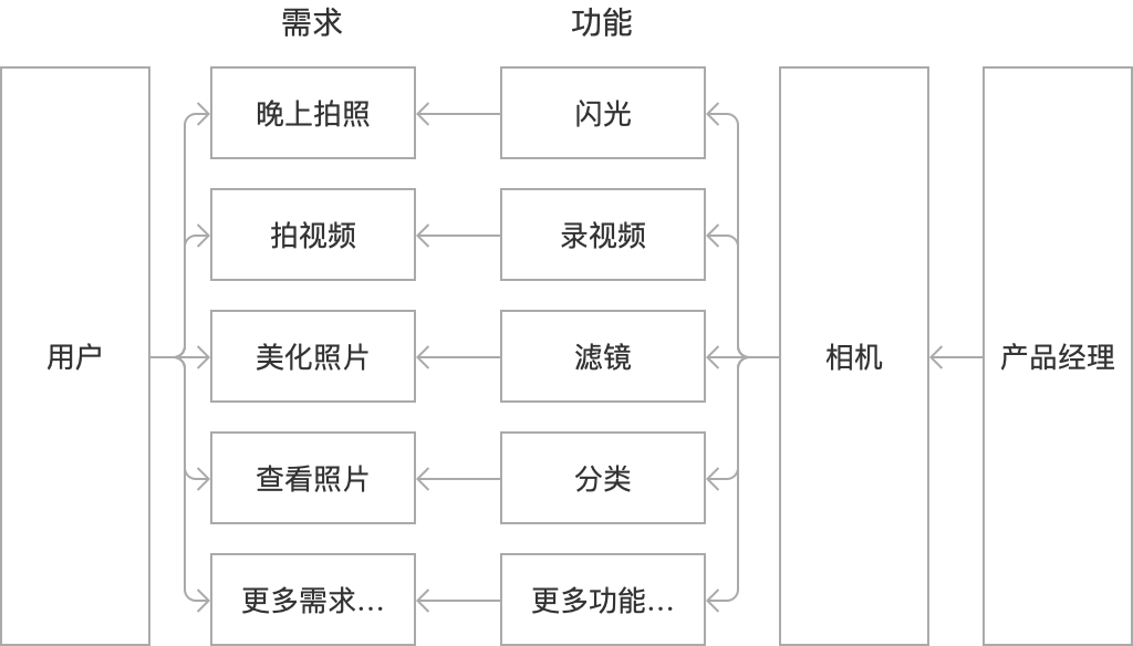 所以用户的问题对应需求,产品的解决方案对应各项功能,通过功能满足需求。