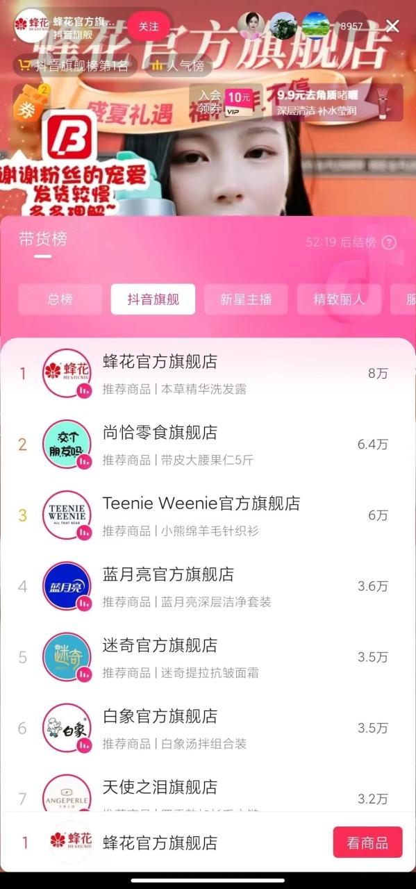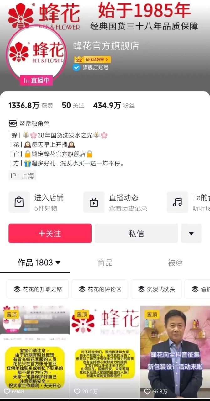 此外,蜂花除了官方旗舰店,还在抖音开启了蜂花个护甄选号、蜂花洗护清洁旗舰店等相关账号并直播。截至9月15日下午5点,蜂花官方旗舰店在抖音旗舰带货榜单第一。