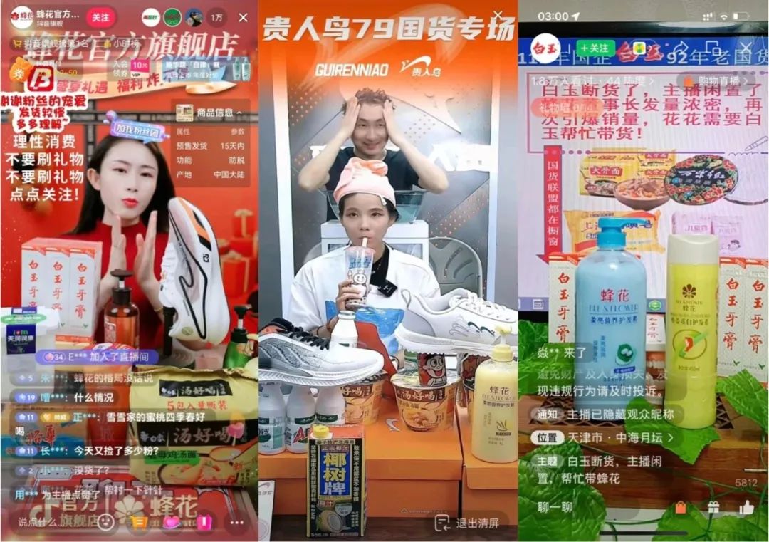 蜂花直播间在自家卖断货后开始卖鸿星尔克鞋、鸿星尔克直播间主播用蜂花洗头、中国邮政直播间放蜜雪冰城主题曲……