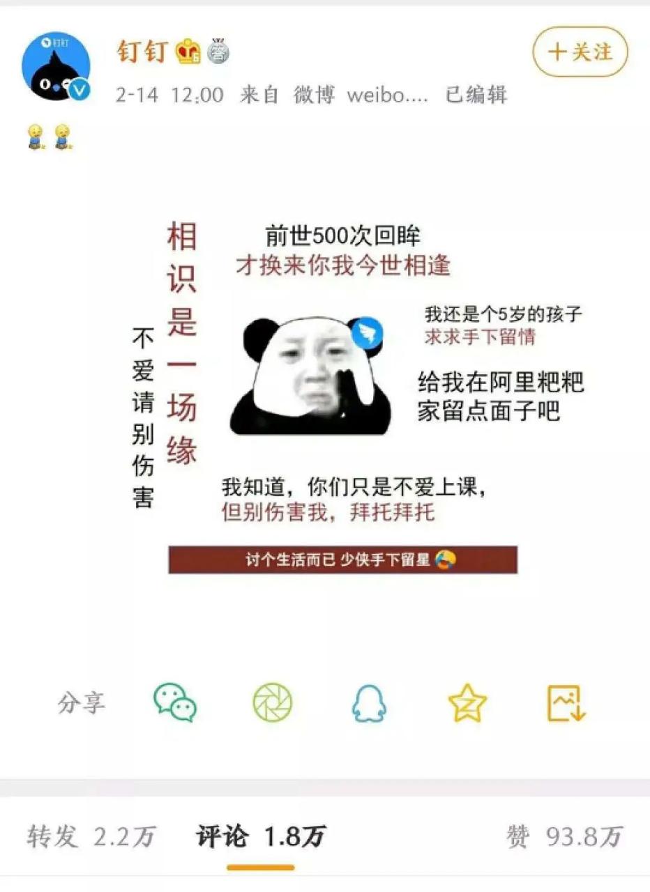 为了挽回形象,顺便和年轻人玩在一起,钉钉下场当起了“段子手”,先是在微博卑微求饶,试图用卖惨说服大家不要再“五星分期付,次次都一星”。