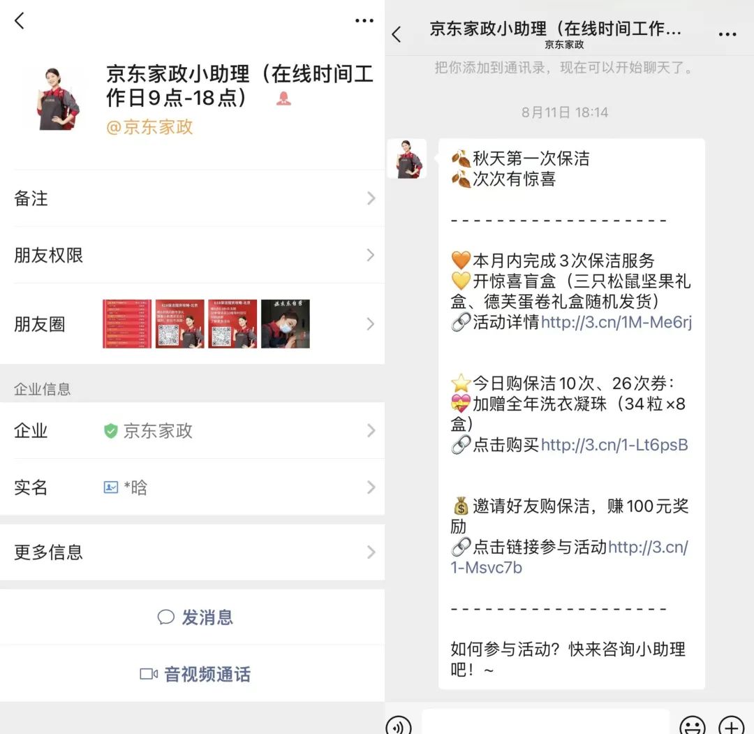 与此同时,京东家政也会将企业微信留存下来的老用户继续精细化运营,根据下单频次、用户习惯及喜好等信息打好标签,以便提供准确的服务,与用户建立起长线信任的关系。