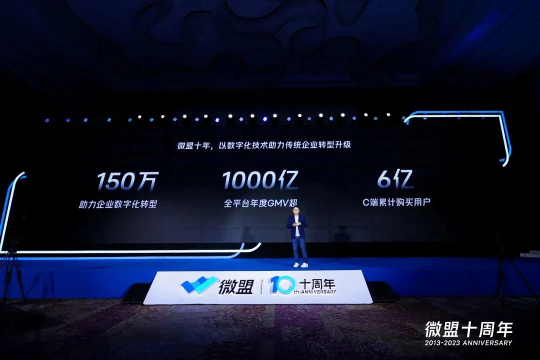 微盟10年,我们以数字化助力传统企业转型升级,我们帮助了150万的企业完成数字化转型,我们现在全平台的年度GMV超1000亿,我们过去累计帮助商家触达的C端用户超过6亿。