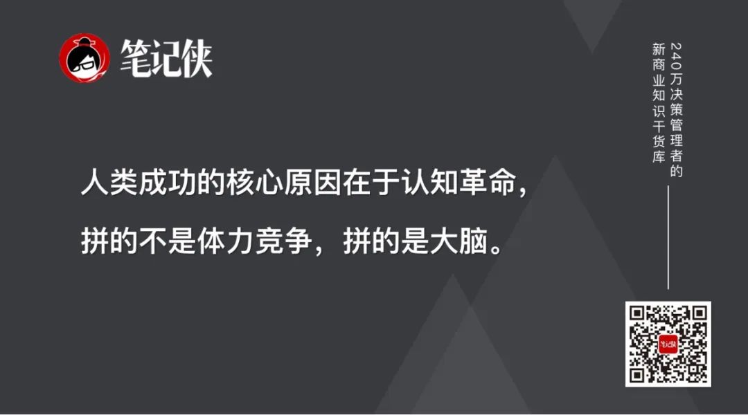 简言之,人类成功的核心原因在于认知革命,拼的不是体力竞争,拼的是大脑。同时,还有合作革命的因素,人类发明了语言,有了语言的沟通,才有更多合作的可能性。这就是“人之道,损不足而奉有余”。